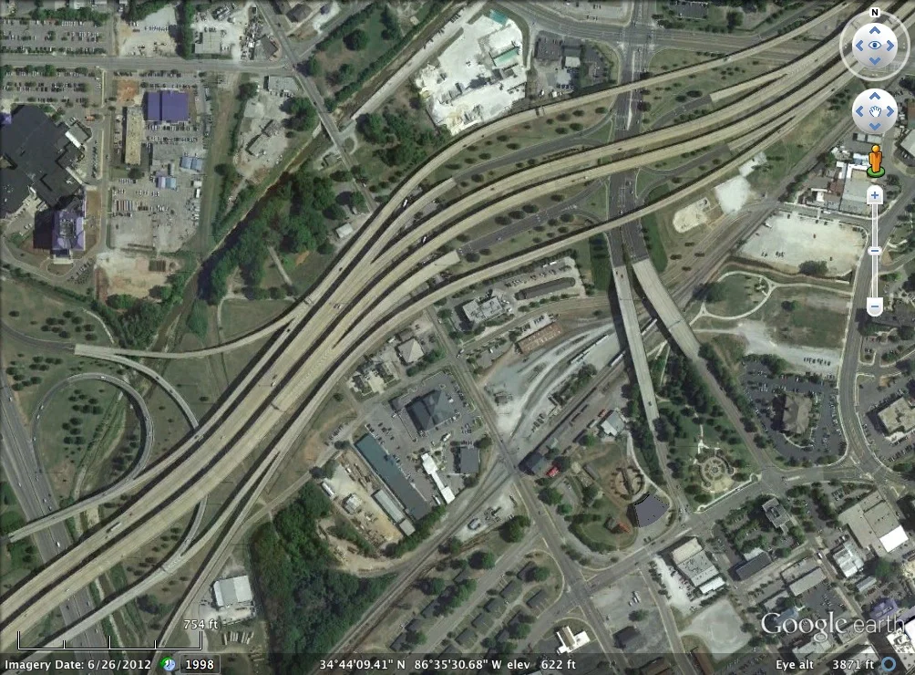 It should be noted that none of those highways are major north-south or east-west highways in the federal system. Interstate 565 is the closest to such a highway, but it's a freeway spur of about 21 miles that connects to Interstate 65. US 231, running north-south, is only a freeway for a few miles in the heart of the city.