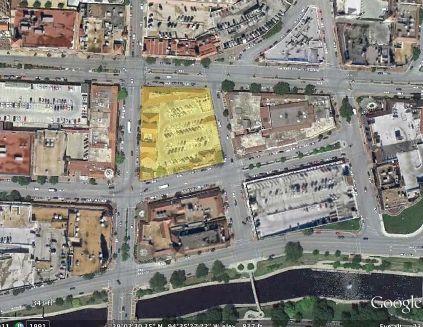 Next up: Country Club Plaza. Imagine this – what if the Plaza actually had – wait for it – a plaza?! This landmark piece of Kansas City is excellent in most respects. But one area that it disappoints is that there’s no outdoor gathering space of any substance, except for Mill Creek Park on the edge. And, accessing the park requires crossing busy and fast-moving Broadway Boulevard. However, in the midst of the Plaza is a space that is nothing more than one-story buildings and the top of an underground parking garage. I’ve often used this block as a good example of how to line a parking lot with simple one-story buildings. But what if this block instead was a true public plaza, with built edges that were more permeable to bring people into it. In fact, the edges could even grow taller in time, creating a stage-set of sorts that would feel like a smaller version of the Plaza Mayor in Madrid. Using quality design could draw people into an unsuspecting space of beauty and grandeur. Simply imagine the uniqueness this space could present, and how well-used it would be. Design: tricky, but talented people could definitely solve it, and with an overall minimum amount of short-term changes.