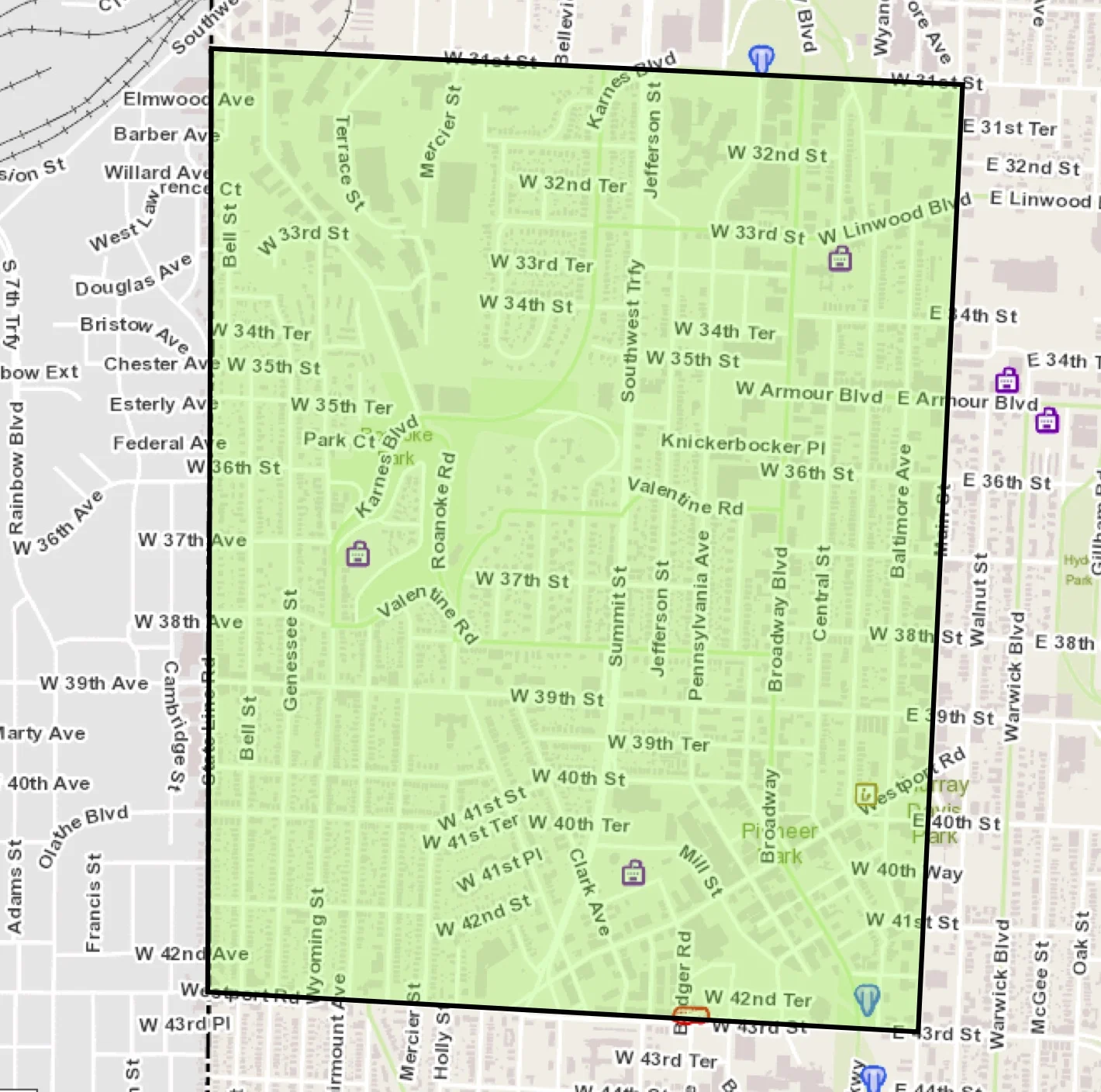 West Midtown in KC, MO - roughly bounded by 31st Street, State Line Road, Westport Road/43rd Street and Main Street. About 1.65 square miles.