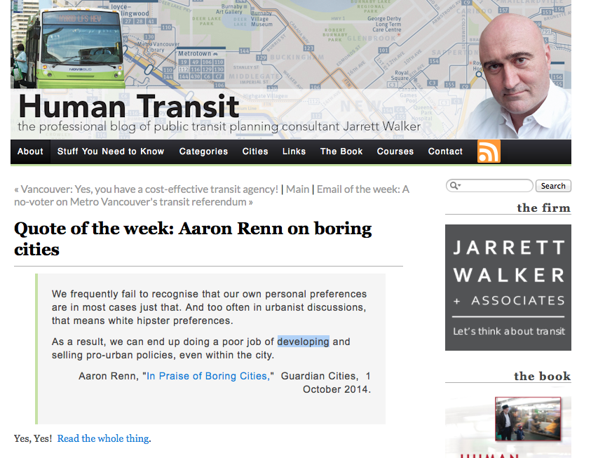 Renn and many others (including folks that I admire like Jarrett Walker and his blog post below): now have displayed on multiple occasions a recurring not-so-subtle message that somehow “hipsters” are a problem or too much of a focus for cities.