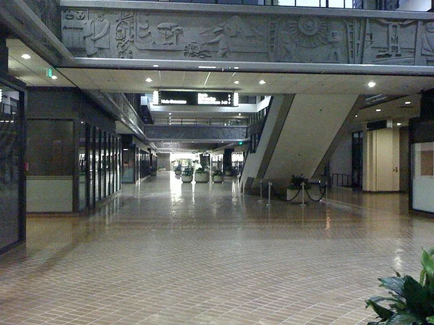 A frieze in the World Trade Center in Bunker Hill was supposed to be the centerpiece of Calvin Hamilton's pedway plan. (Flickr user jann_on) and Citylab