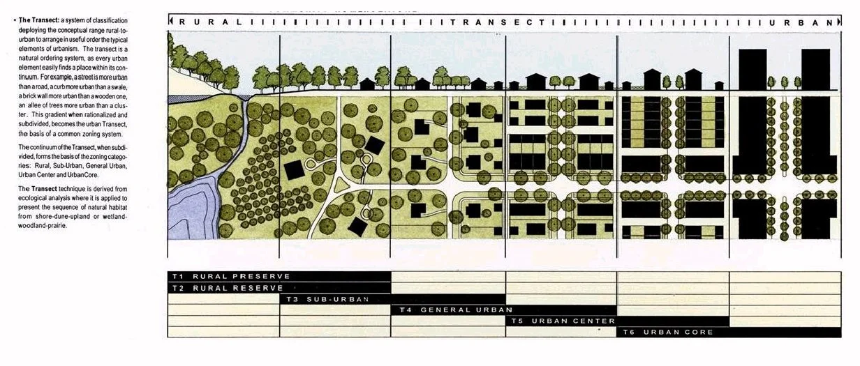 For years, the New Urbanism has used the Transect as a framework to graphically portray the different living environments humans might undertake. Ranging from rural to urban, the 6 categories have become common lingo in the planning world.