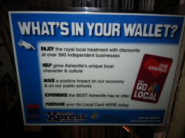 What I've found most fascinating in the whole PIP/Julian Price story is how they used private investment and development to build a successful local economy. If you visit Asheville today, you can see how those seeds bore fruit. The streets are filled with unique, locally-owned businesses instead of the typical barrage of chain stores. The whole town has a culture that supports local (see picture above). That keeps money in the regional economy and creates wealth instead of shipping dollars off to a corporate hq somewhere else.
