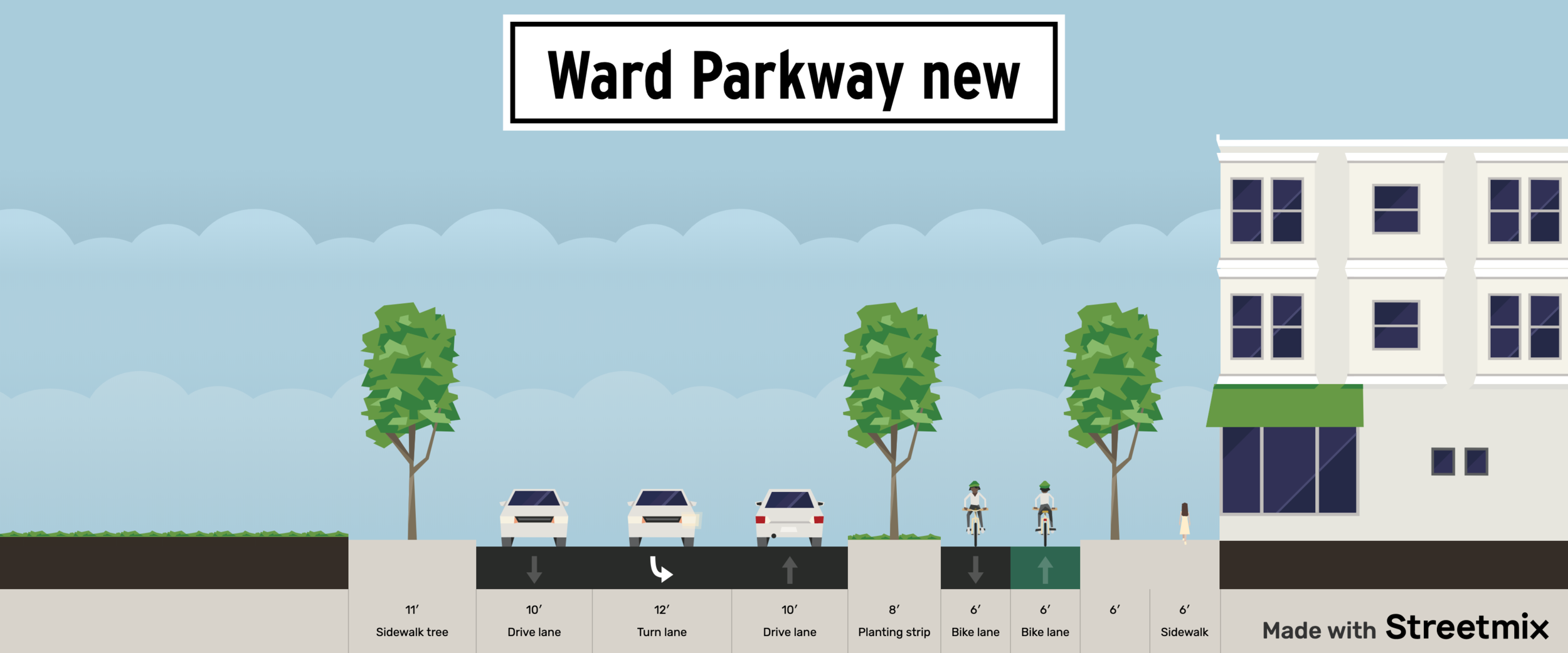Finally, while we’re at it, let’s go ahead and do something similar to the absurdly-wide, four-lane, one-way section of Ward Parkway between Baltimore and Brookside Boulevard. Here’s what that change looks like.